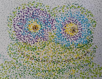 Use cotton swabs to paint in your sketch. Don’t mix the colors! For example, if you need to make a purple car, use blue and red dots to paint that car in. If you need lighter green and darker green, use green and yellow or white dots for the lighter area, and green and black or brown dots for the darker area. Play around with colors and have fun!